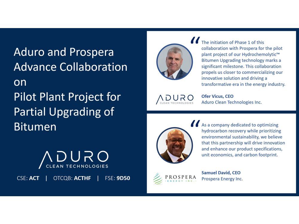 Aduro Clean Technologies and Prospera Energy Advance Collaboration on Pilot Plant Project for Partial Upgrading of Bitumen August 8, 2023 by Sarnia_Man SARNIA, Ontario, Aug. 08, 2023 (GLOBE NEWSWIRE) —