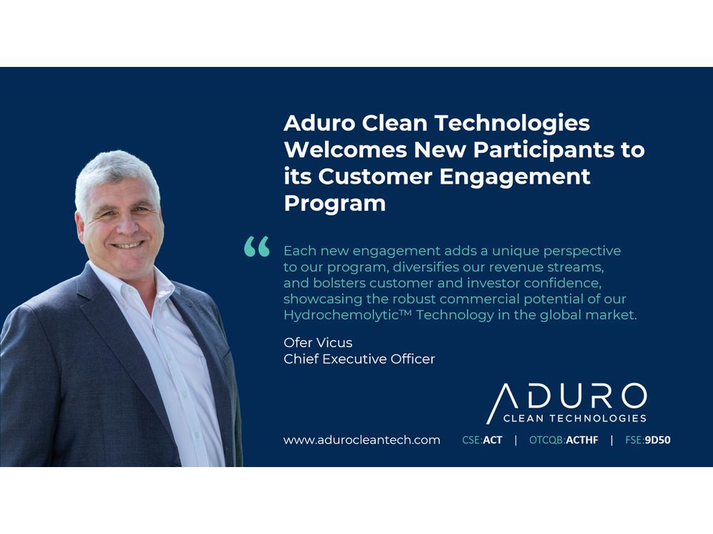 Aduro Clean Technologies Welcomes New Participants to its Customer Engagement Program October 11, 2023 by Sarnia_Man SARNIA, Ontario, Oct. 11, 2023 (GLOBE NEWSWIRE) —